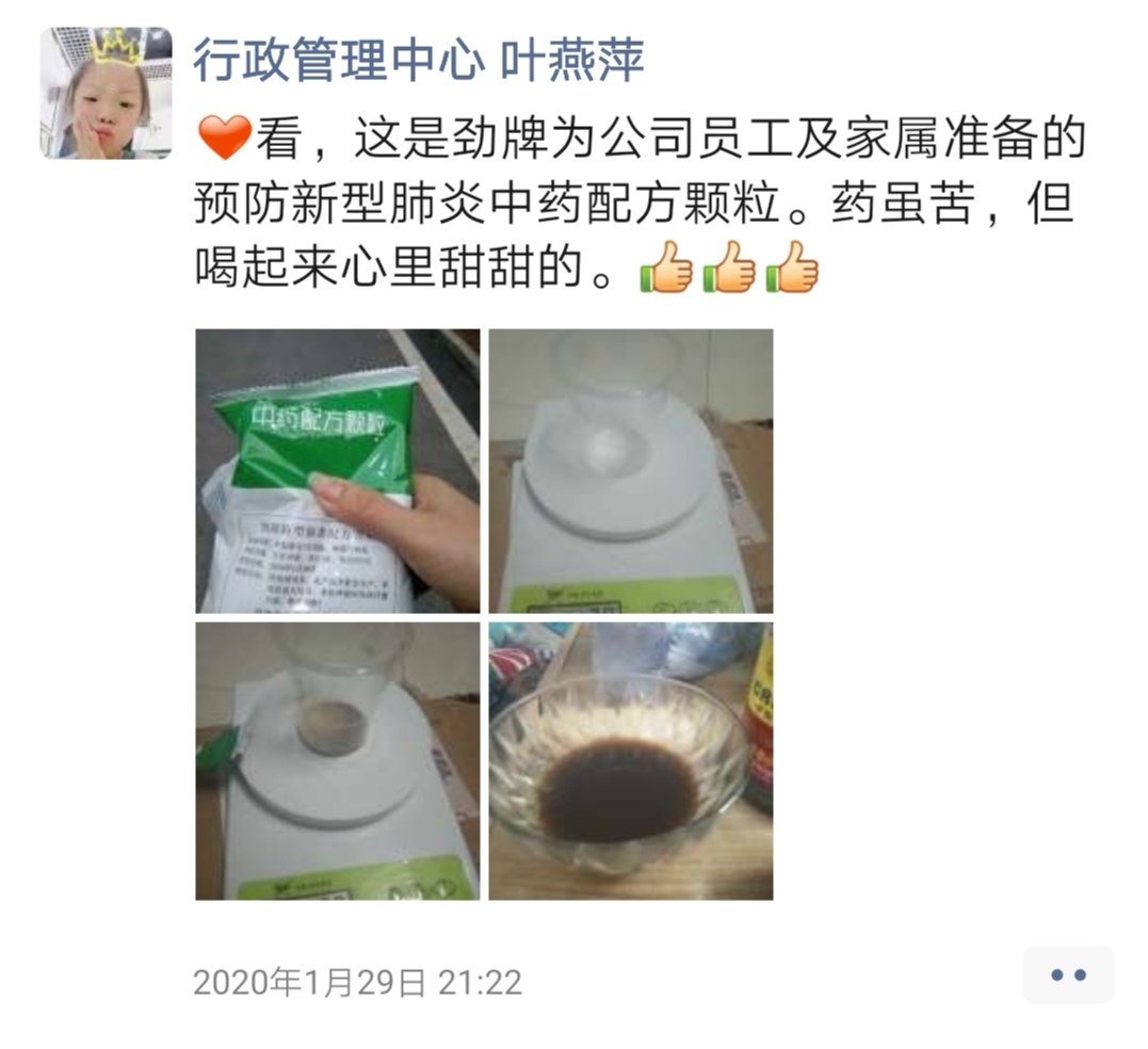 收到這份關(guān)愛(ài)多人,除了對(duì)公司滿(mǎn)懷的感恩,還有對(duì)背后生產(chǎn)者的傾情致敬。正如今日的頭條所說(shuō),正是我們這些一線(xiàn)生產(chǎn)者的日夜兼程,才有這一份份滿(mǎn)含愛(ài)心的中藥配方顆粒,被運(yùn)送到所需要的四面八方,小小的一盒到底凝結(jié)了多少人的心血,我們每個(gè)勁牌人應(yīng)該深深銘記。