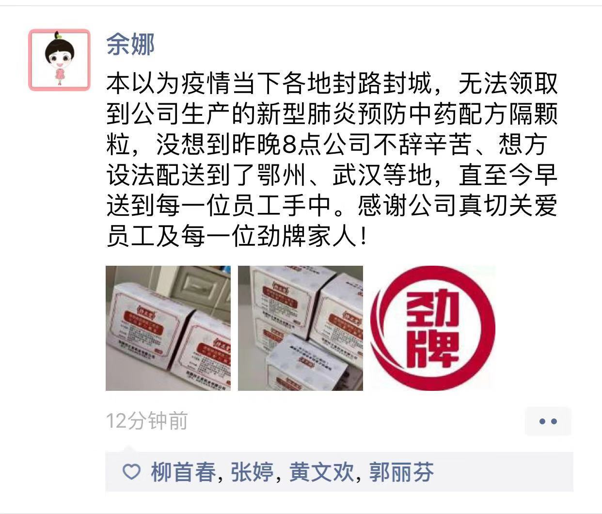 但對(duì)于居住大冶之外的人來(lái)說(shuō),收到這份關(guān)愛(ài)是格外的不易和感動(dòng)的,正如這位同仁所說(shuō)的那樣,在封城封路的情況下,公司需要破費(fèi)周折才能將這一袋袋顆粒送到他們及其家人手中,運(yùn)送的每一里程包含的都是勁牌濃濃的人文關(guān)懷。
