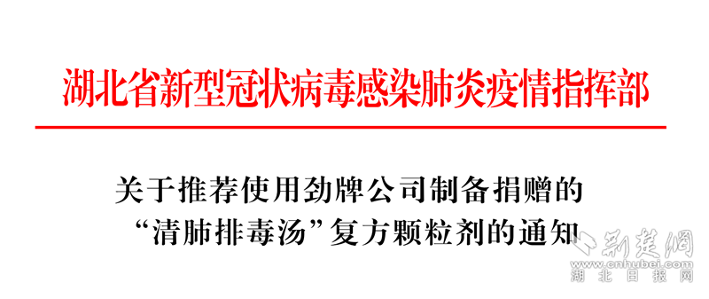 2月22日,湖北省新型冠狀病毒感染肺炎疫情指揮部下發(fā)《關于推薦使用勁牌公司制備捐贈的“清肺排毒湯”復方顆粒劑的通知》。通知說明,為切實加強湖北省新型冠狀病毒感染肺炎防治工作,充分發(fā)揮中醫(yī)藥在新冠肺炎治療中的作用,決定在全省定點醫(yī)療機構、方艙醫(yī)院、集中隔離治療點推薦使用勁牌持正堂藥業(yè)制備并捐贈的“清肺排毒湯”復方顆粒劑。